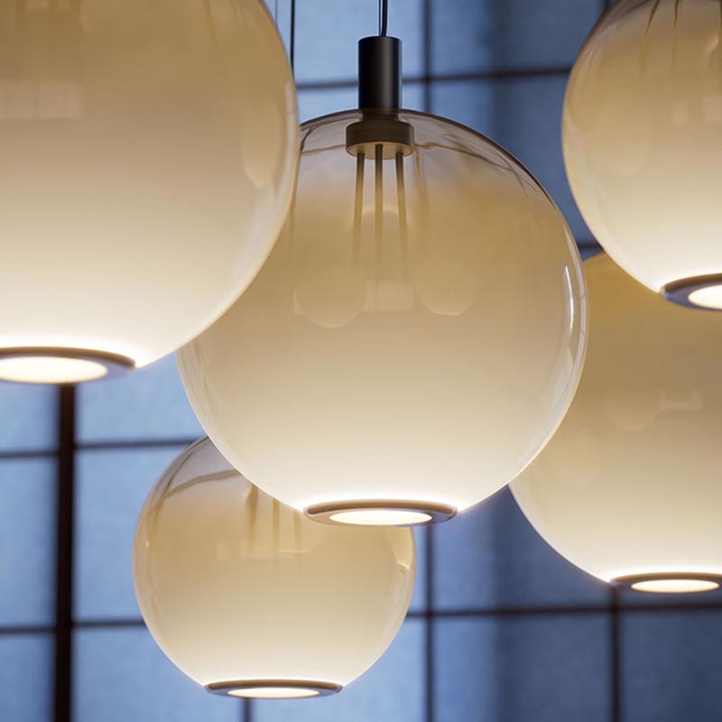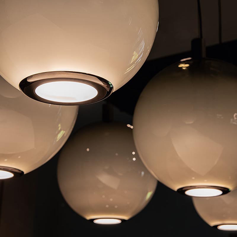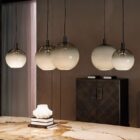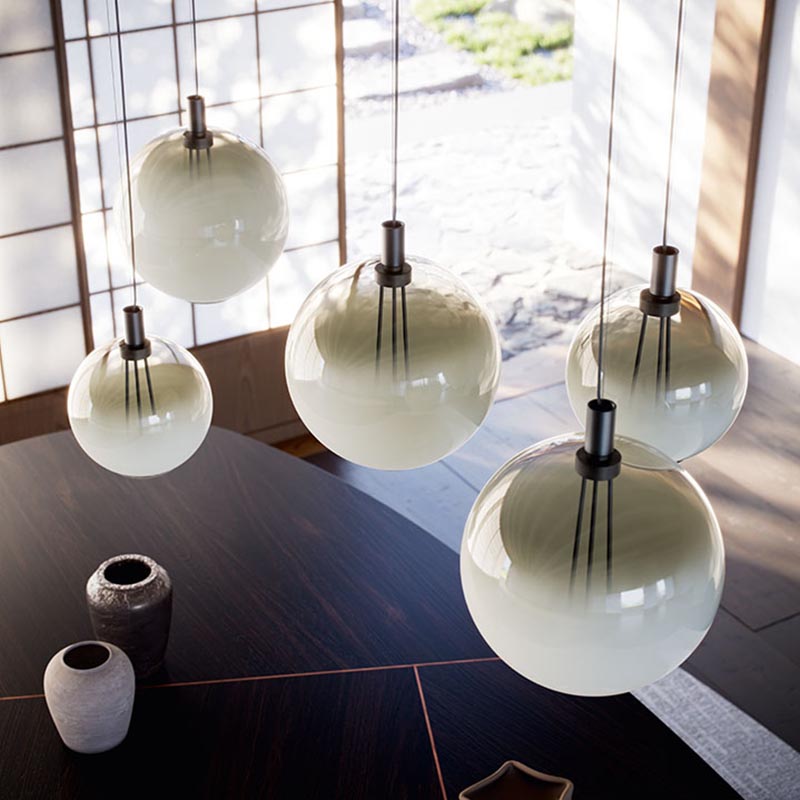 These modern lamps allow for endless configuration possibilities, letting you create unique arrangements that reflect your personal taste. Each lampshade can be suspended individually from the ceiling or mounted on a circular base that holds between two and six pendants, arranged at varying heights and distances, and in different sizes.